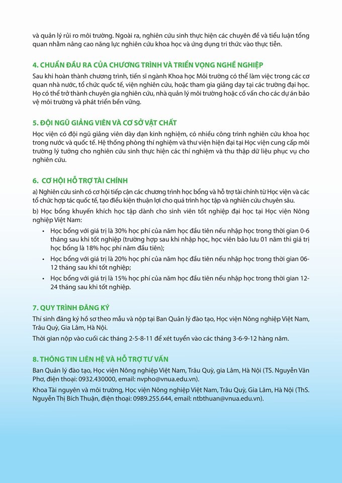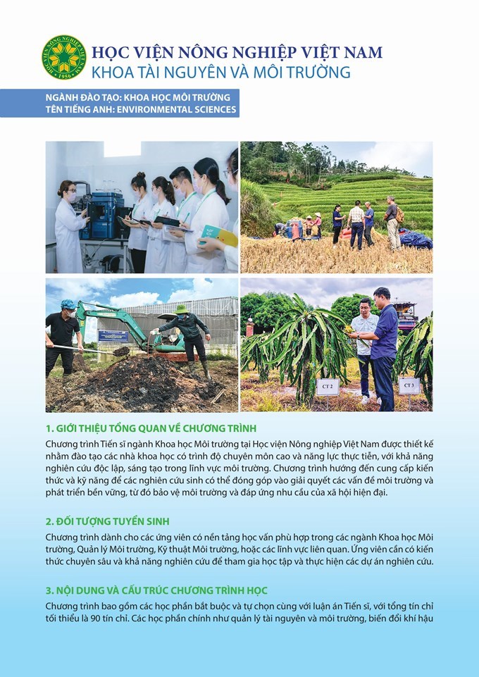 Chương trình Tiến sĩ ngành Khoa học Môi trường tại Học viện Nông nghiệp Việt Nam được thiết ké nhằm đào tạo các nhà khoa học có trình độ chuyên môn cao và năng lục thực tiễn, với khả năng nghiên cứu độc lập, sáng tạo trong lĩnh vực môi trường.